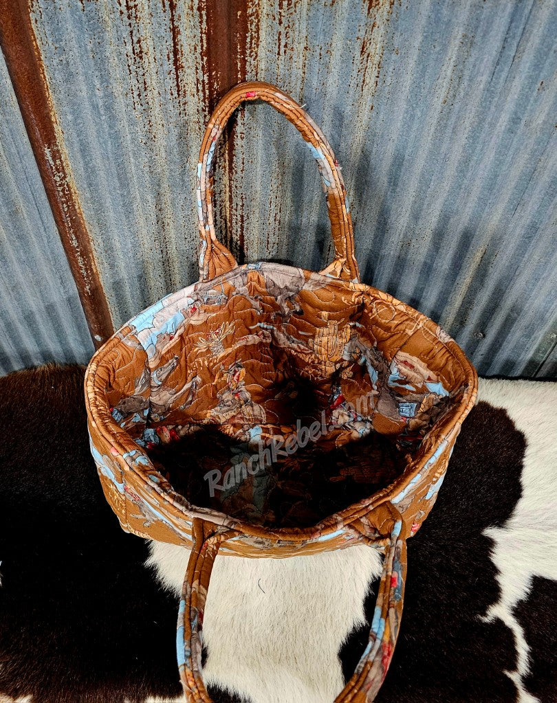 A quilted handbag with an open top & double, rolled handles in a fun, retro cowgirl print.