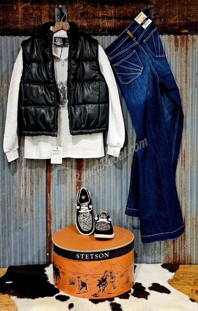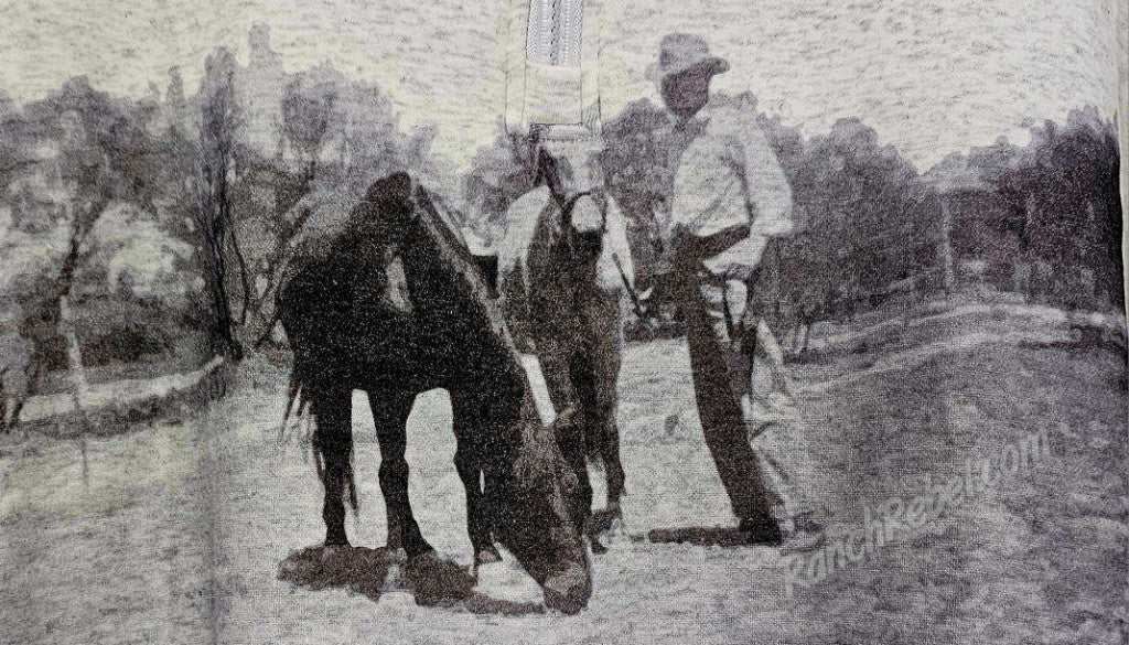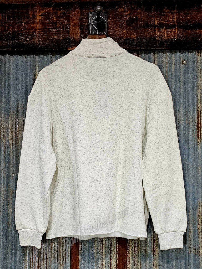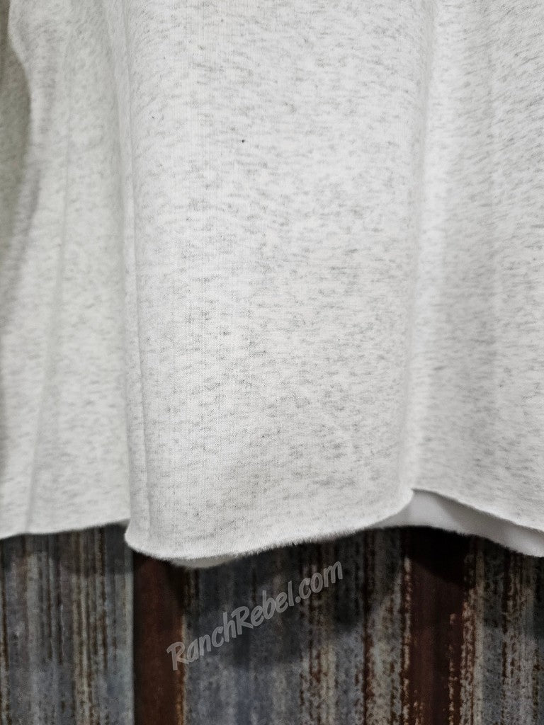 A light heather gray sweatshirt with cozy, soft, fleece lining & a zip neckline. The front features a black & white old photo of a rancher & his horses. It has rib knit trim at the cuffs & a raw edge bottom hem.