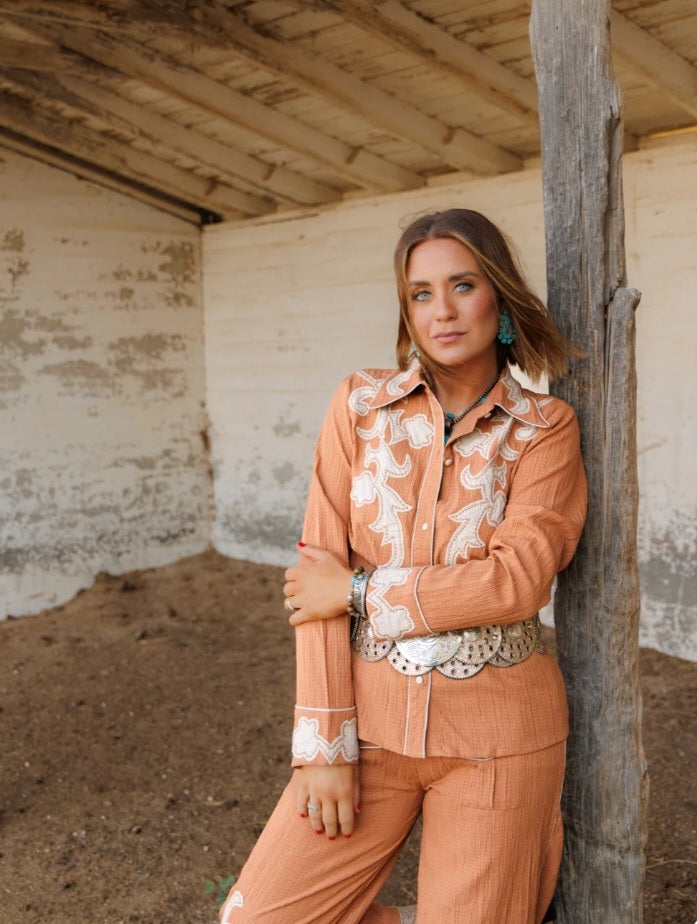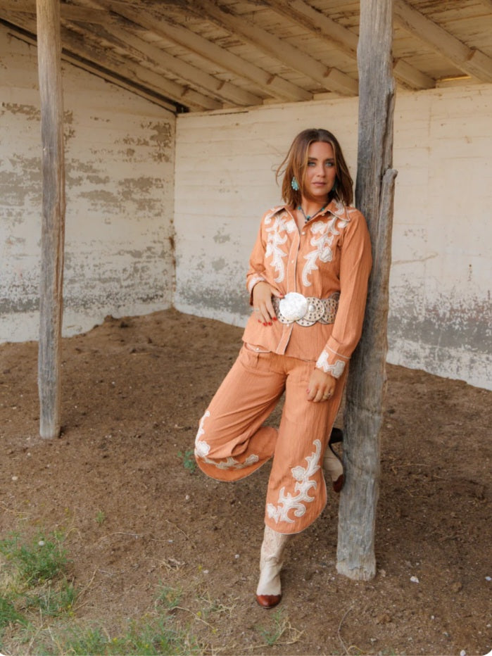 An amazing & unique top in an apricot color with natural colored western appliques. It has fabric covered buttons on the front placket trimmed in natural piping, a retro collar with applique details & piped cuffs with applique details. It has a straight back yoke piped in a natural color. The fabric has unique texture & a slight sheen to it. Pair it with the matching pants for a set that's truly to die for.