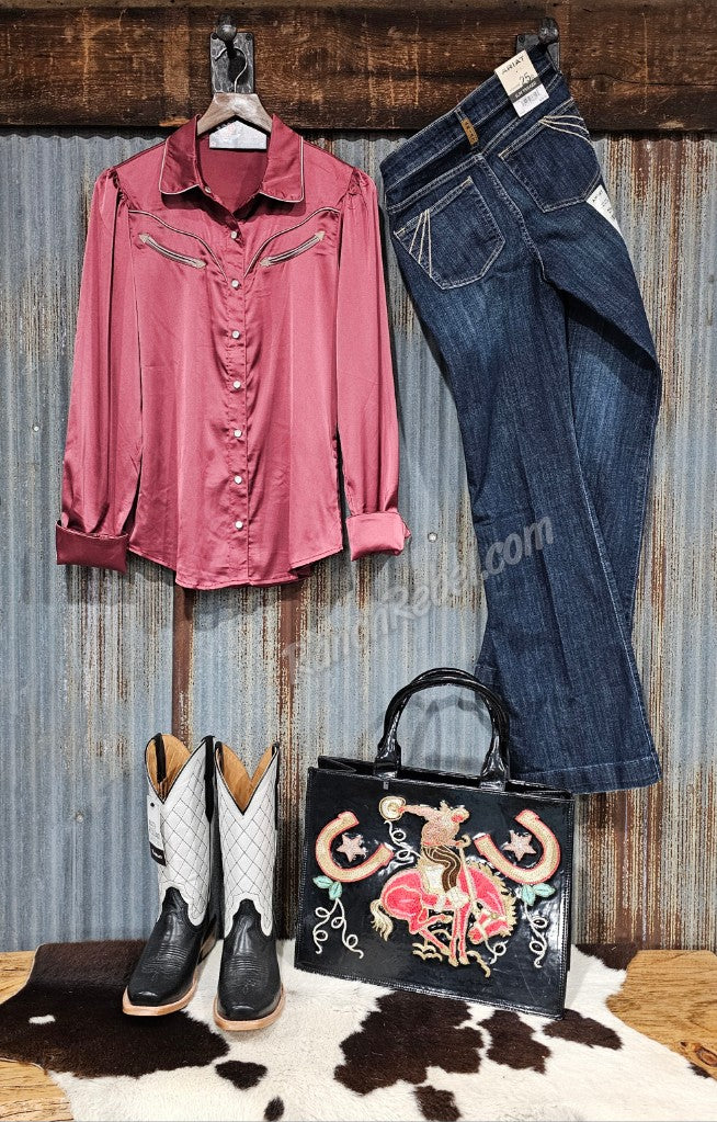 A satin pearl snap shirt with taupe colored piping along the collar & front & back western yokes. It has taupe colored front faux arrow pockets & long, two snap cuffs that can be turned back.