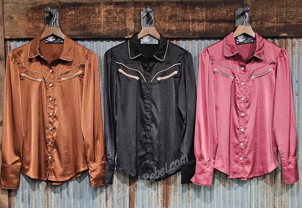 A satin pearl snap shirt with taupe colored piping along the collar & front & back western yokes. It has taupe colored front faux arrow pockets & long, two snap cuffs that can be turned back.