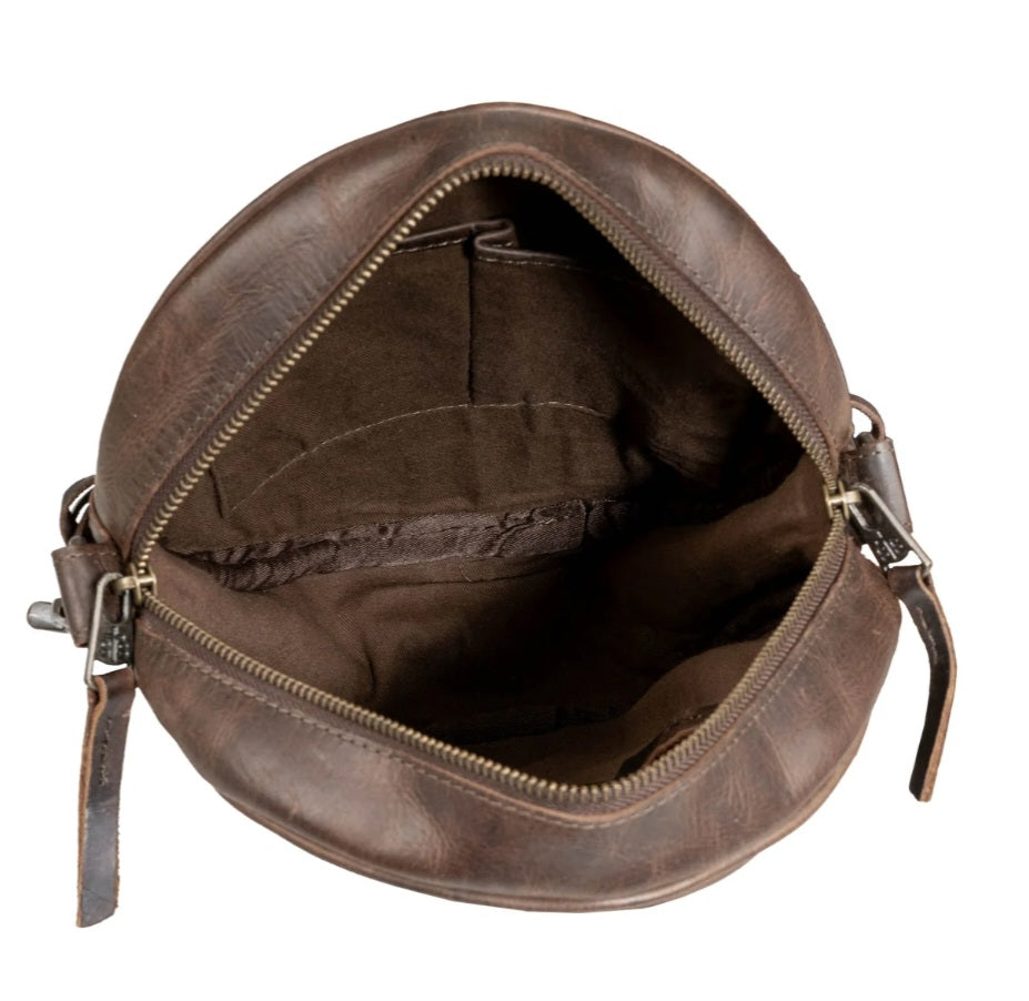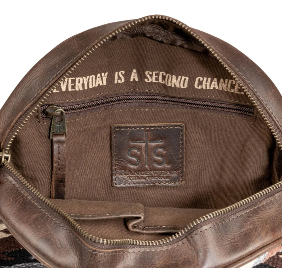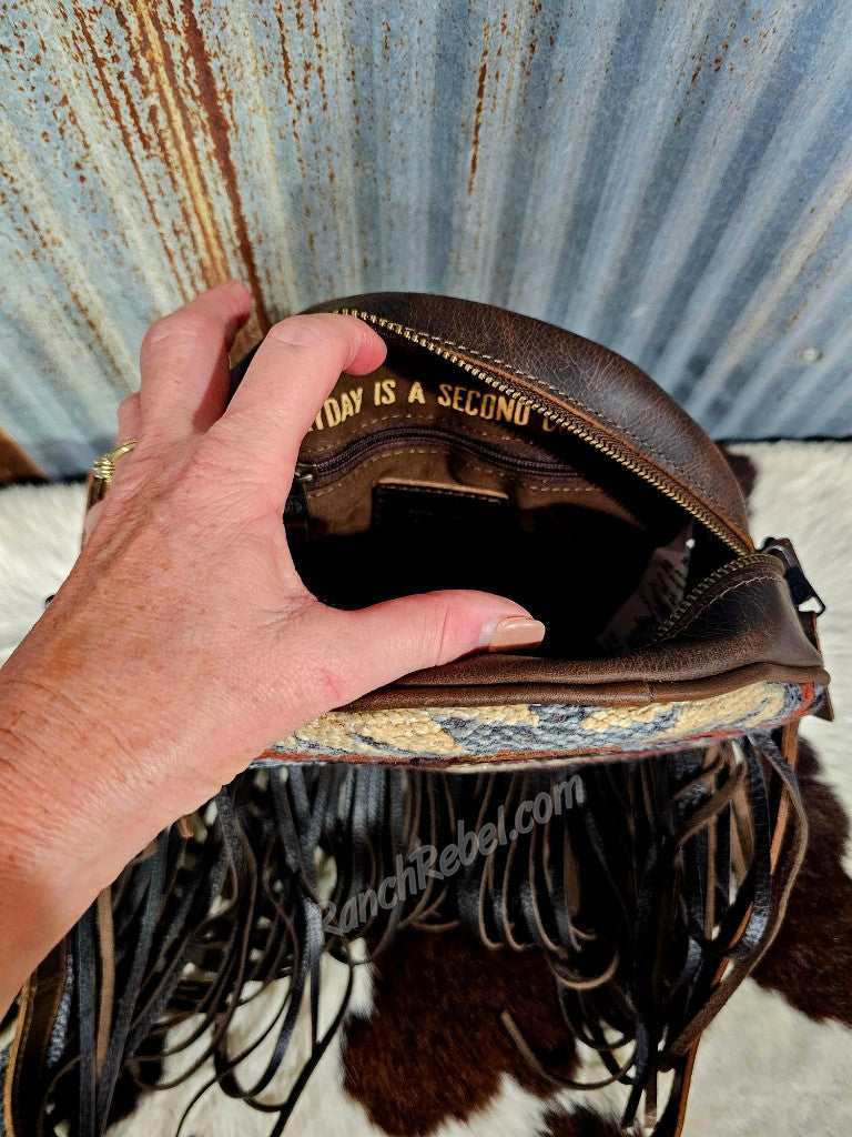 Dark brown leather combined with heavy serape fabric in southwestern earth tones of cream, chocolate, black, rust & denim blue. The Sage Crossbody is a round bag with a serape front & smooth leather sides & back. The back has a large slip pocket with a strong magnetic closure. It has a zip top & inside is a side zip pocket & two slip pockets. "Everyday is a second chance" is printed inside. It has leather fringe around the side & bottom. It has a long, leather strap which is adjustable with a slide buckle.