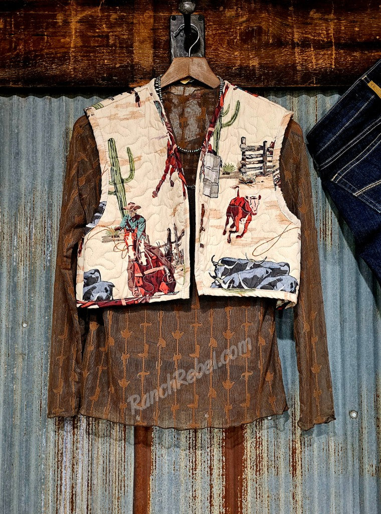 A cropped, quilted vest with a retro ranch & rodeo print featuring ropers, barrel racers, steers, fence & cactus on a tan background. It has an open front & the inside fabric is a brown gingham print.