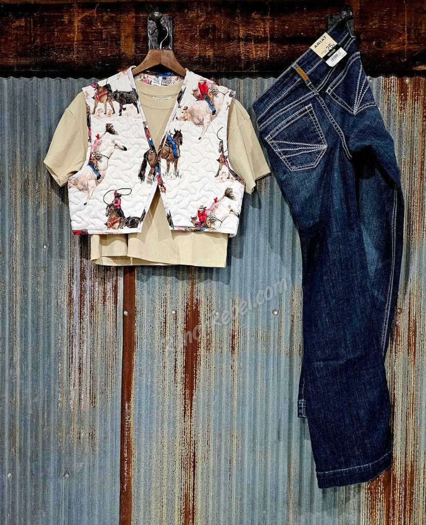 A cropped, quilted vest with a rodeo print featuring bullriders, team ropers & saddle horses on a white background. It has an open front & the inside fabric is a small rose & dot pattern.