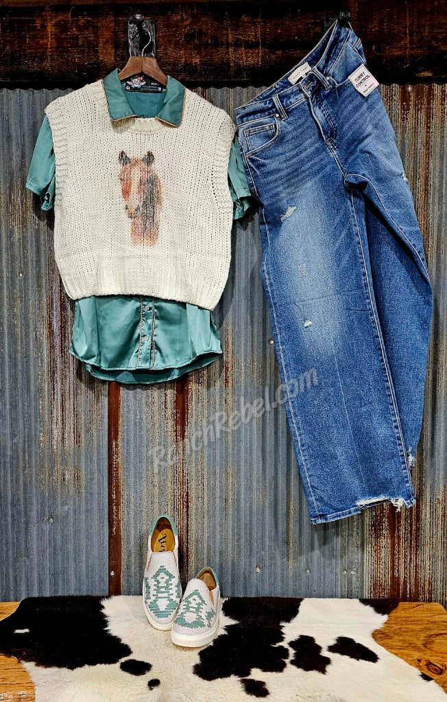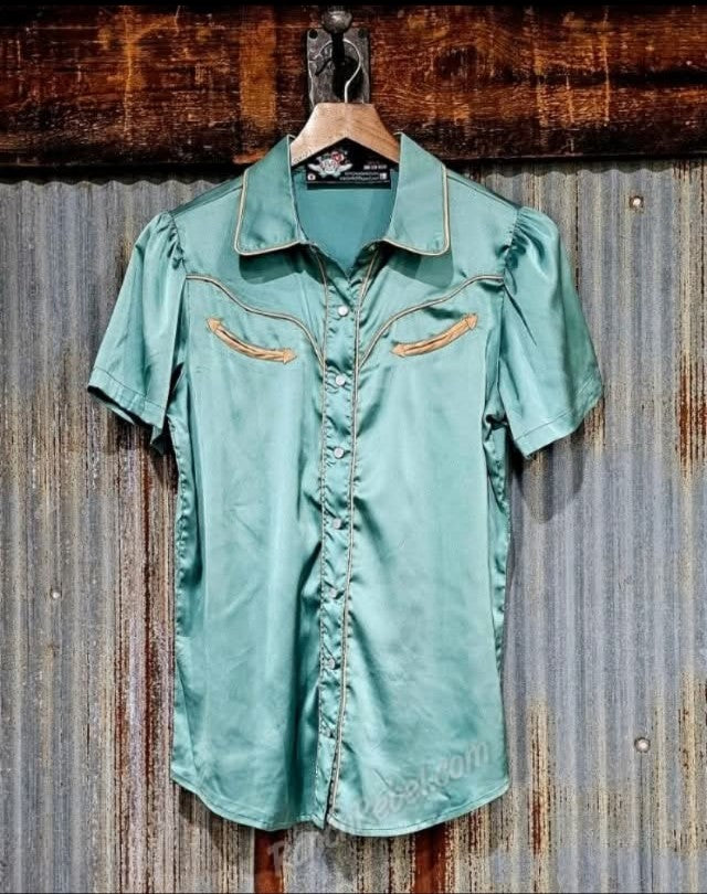 A teal satin top with a white pearl snap front, gathered, short sleeves & faux arrow pockets with suede accents in tan. It has a piped front & back western yoke, piped trim around the rounded collar & along the front placket all in tan.