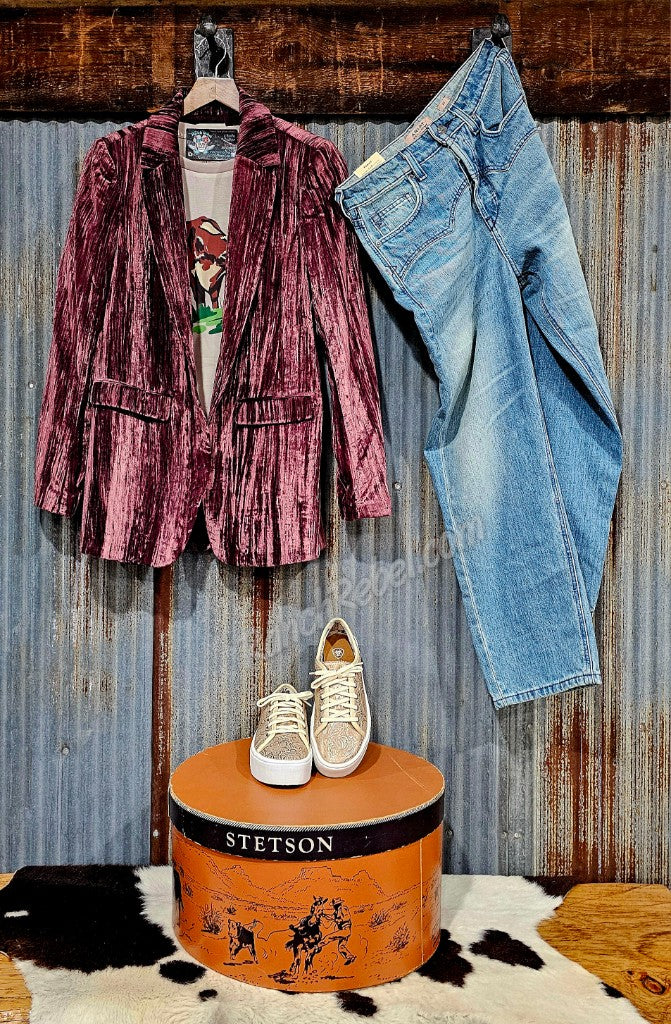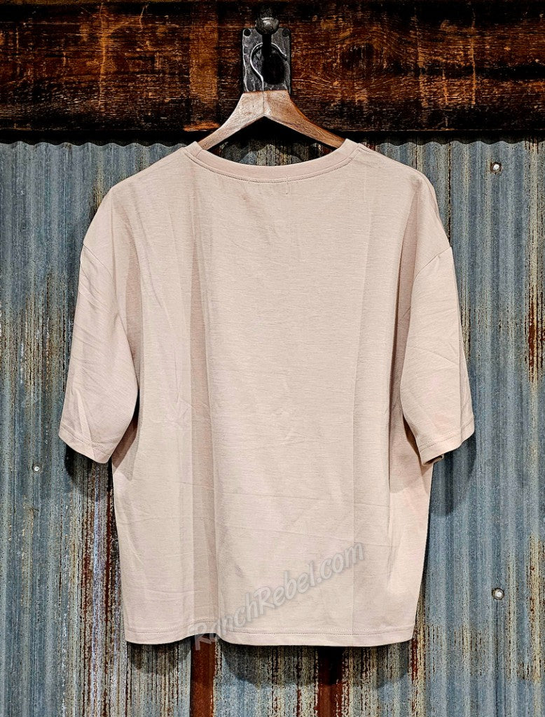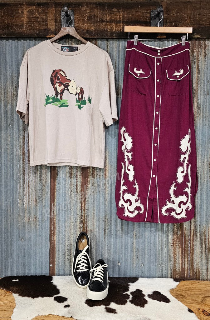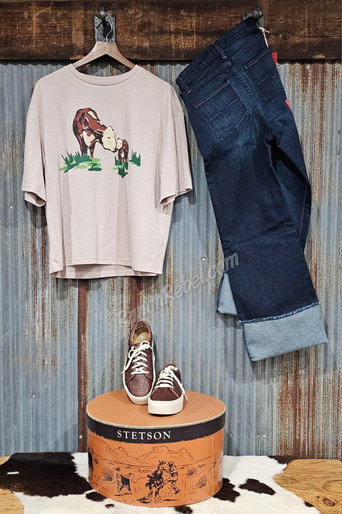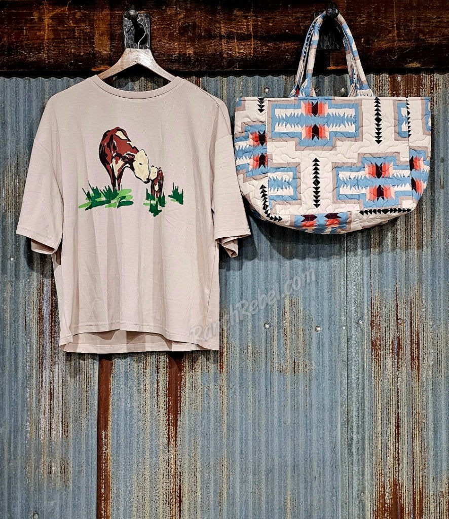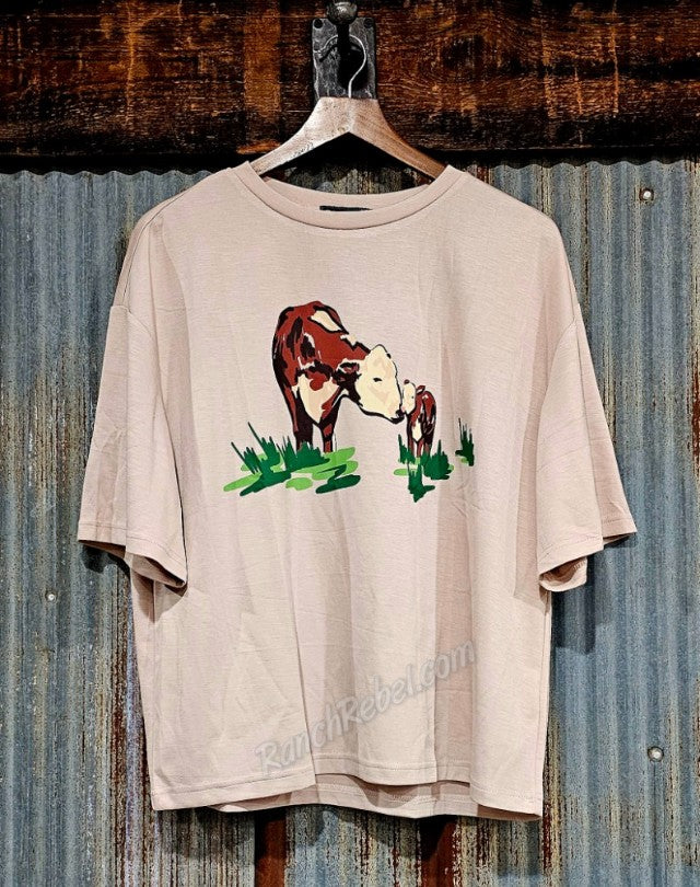 A super soft, pale mauve colored, oversized tee with a Hereford Cow Calf pair. Fun for year round wear with lots of styling options.