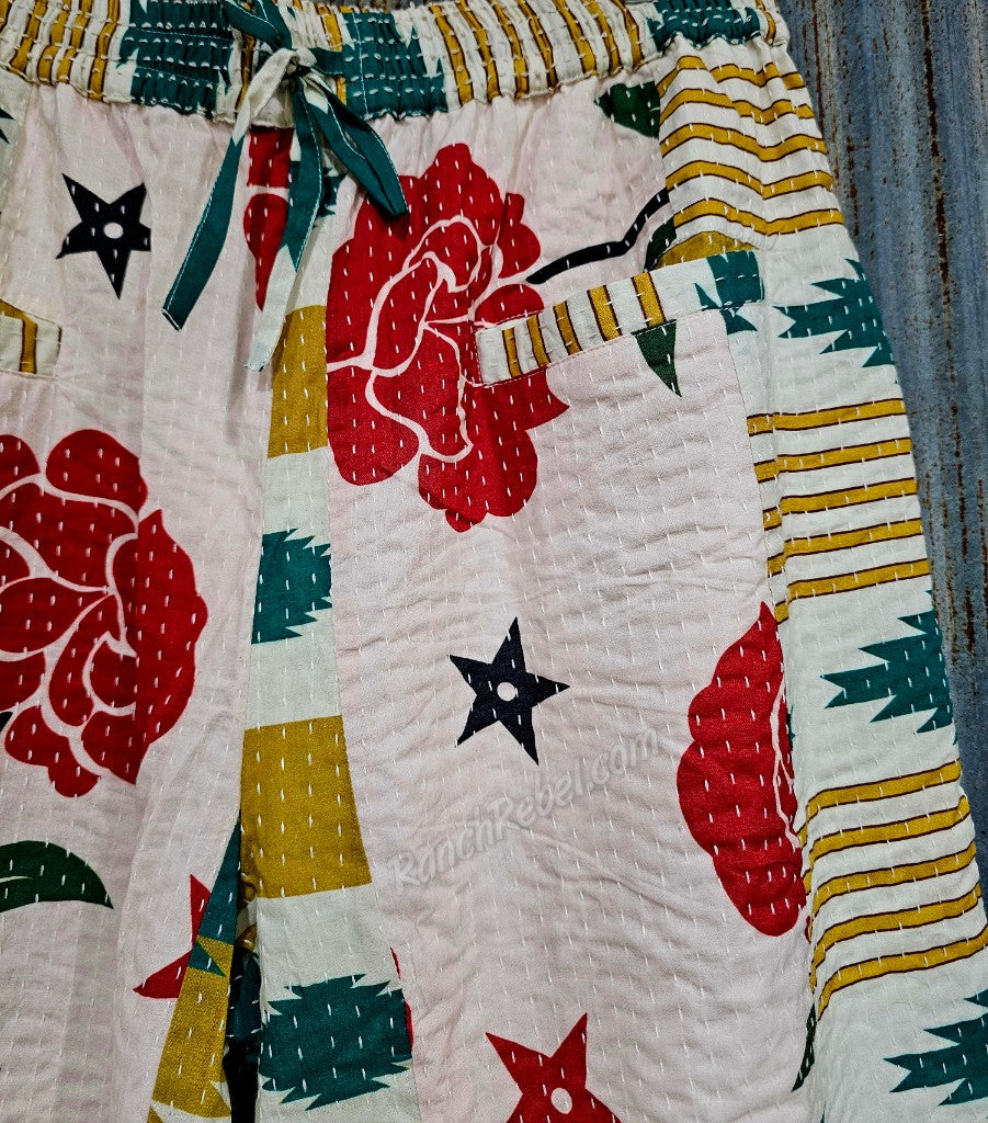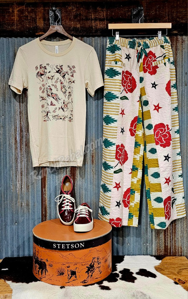 Designed to turn heads, these feature a vivid red rose, star & Aztec print in reds, greens, mustard, blush & natural. They have a relaxed, easy fit with wide legs, an elastic waist with a drawstring & front pockets.