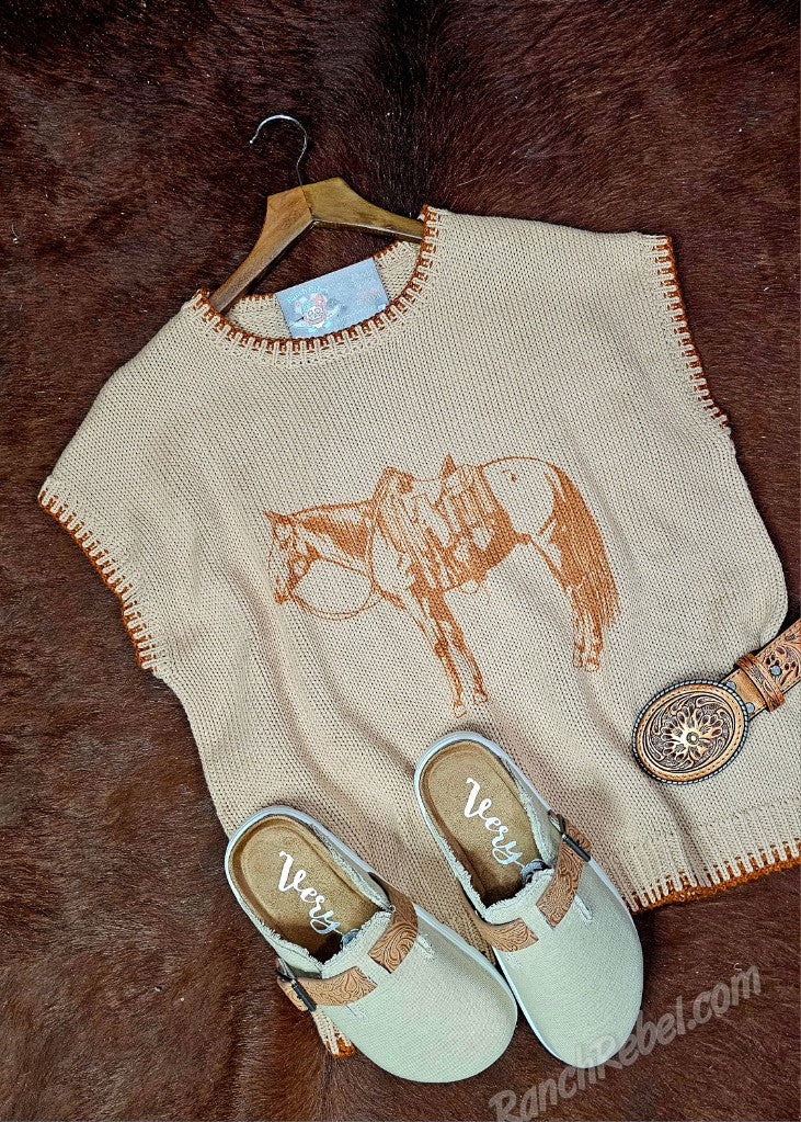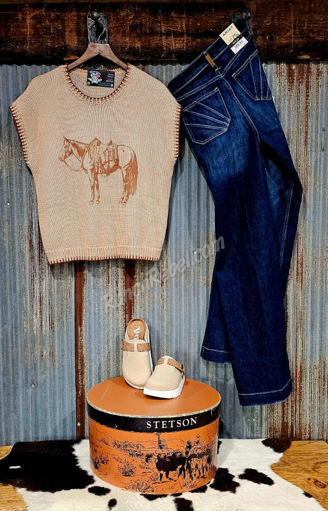 A light apricot colored sweater vest with sorrel trim around the neckline, cap sleeves & bottom hem. The front features a saddled ranch horse in the same sorrel trim color. Cute alone or layered under something or over a long sleeve mesh or denim top.