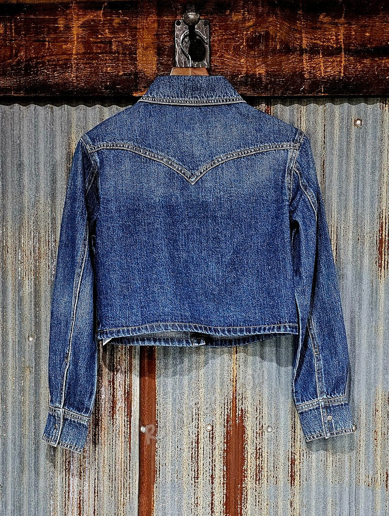 Super soft, lightweight denim in a darker wash. It has a snap front, single snap cuff, one chest pocket with tan bootstitch embroidery, & back western yoke. Wear it alone, or layered over a tee, tank or dress. Wear it with our Calamity Comfort Wide Leg Jean for the perfect denim outfit.