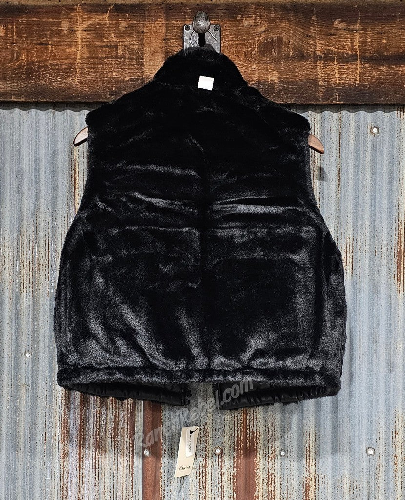 Get more bang for your buck with this cute, reversible, puffy vest!  One side is black faux  leather, the other side is black faux fur.  It has a zip front, elastic waist, hand pockets on each side, with one side snapping shut, & a stand up collar.  Slightly cropped.