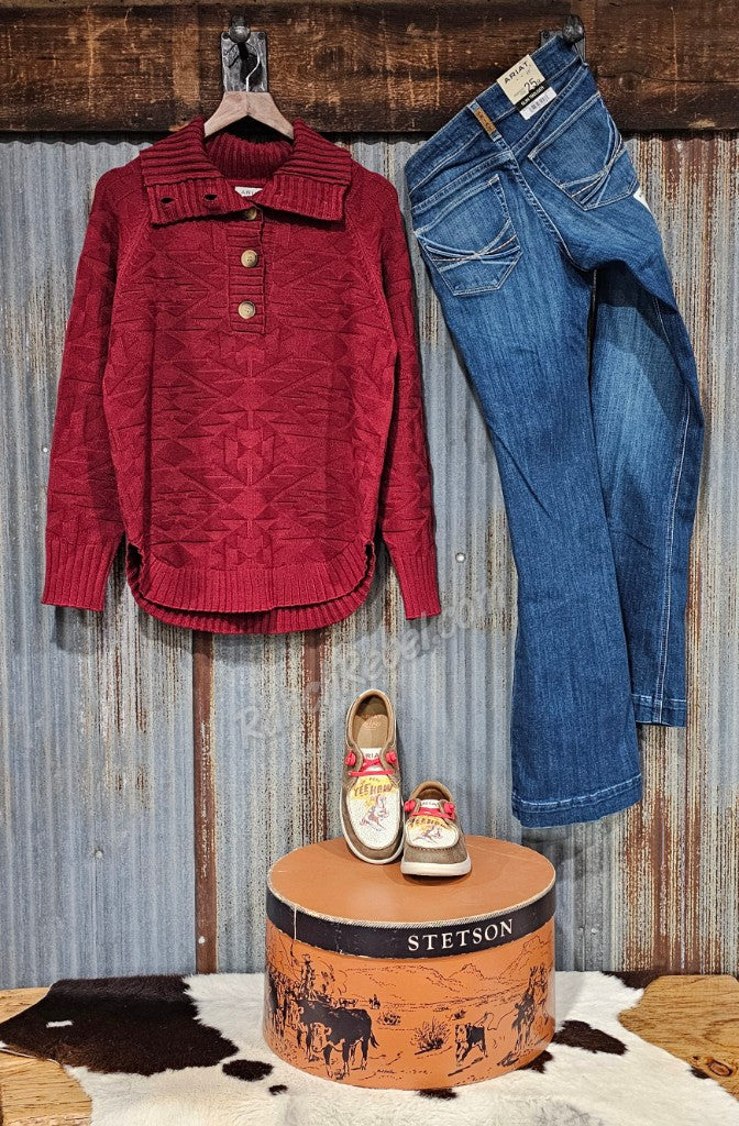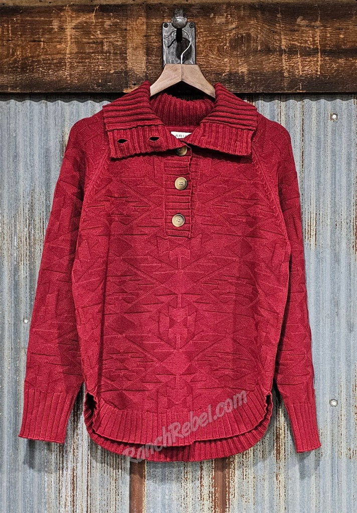 A deep red sweater with a southwest knit design.  It has five large wood look buttons at the neckline.  Wear it buttoned as a cowl neck. or unbuttoned for a collared look.  It has a rounded bottom hem with contrast knit design.