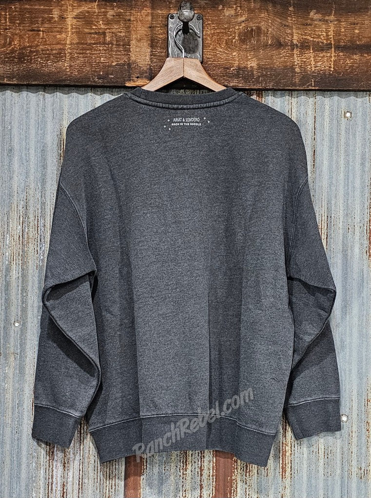 An oversized charcoal sweatshirt with cozy fleece lining. It has rib knit trim around the neckline, cuffs & bottom hem. It has a skeleton cowboy graphic on the front. "When Life Gives You Agaves".