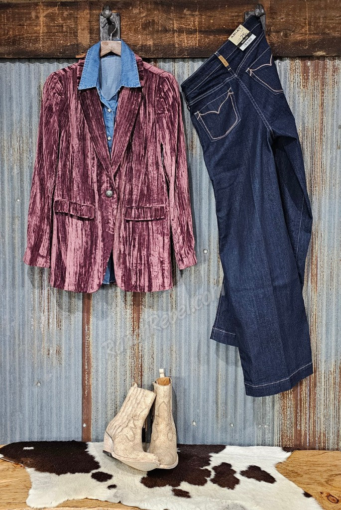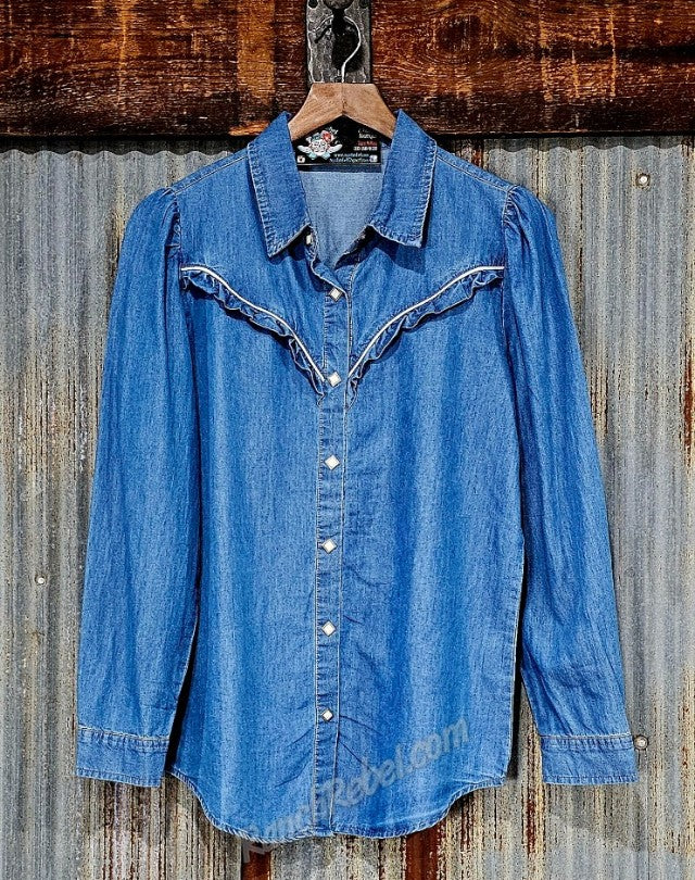A lightweight denim shirt with a front & back western yoke with white piping & a small ruffle outlining the yoke.  It has diamond shaped pearl snaps on the front placket & single button cuffs.  A great wardrobe staple for the western woman.