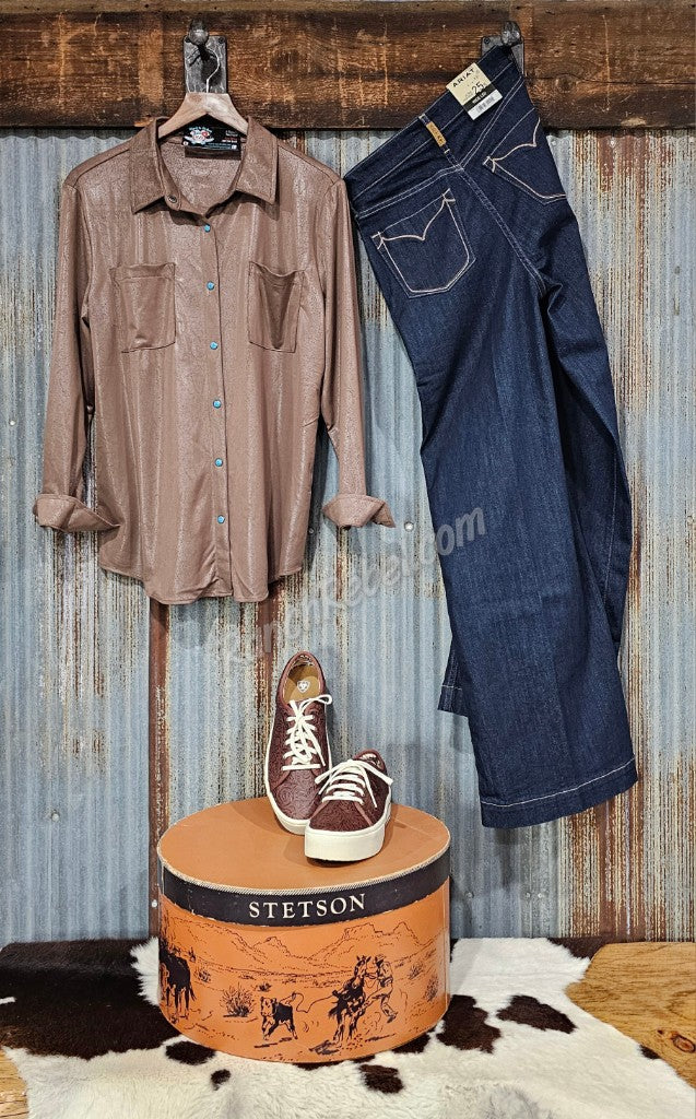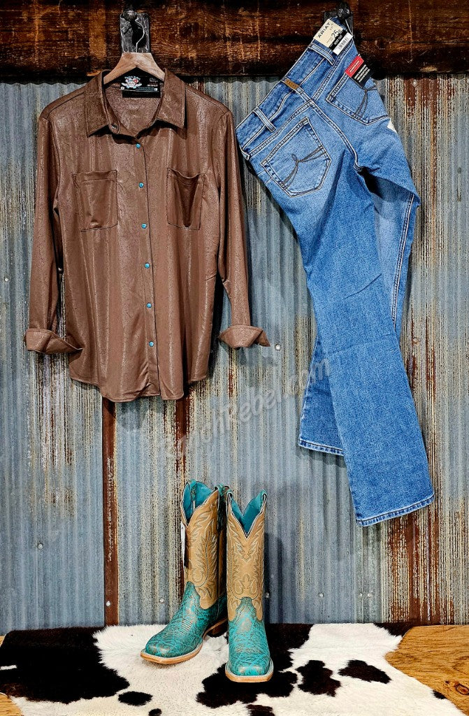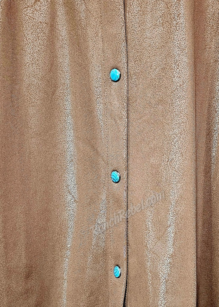 The look of leather in a soft, washable fabric. This stretchy, chocolate brown colored top has turquoise pearl snaps on the front & cuff for a pop of color. It has two open chest pockets & a back western yoke.
