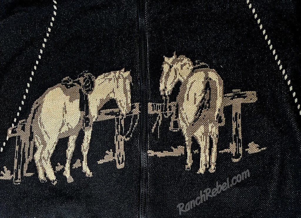 A black hooded sweater with a zip front & side pockets.  It has saddled Palomino ranch horses tied to a fence on the front with some buckstitch trim.  Wear it alone or layered over graphic tees or tanks like a jacket.