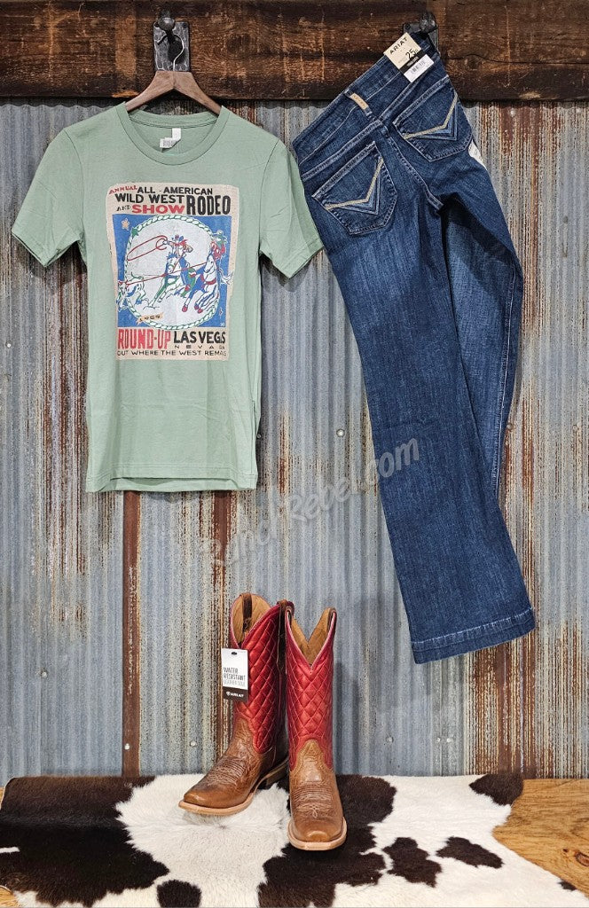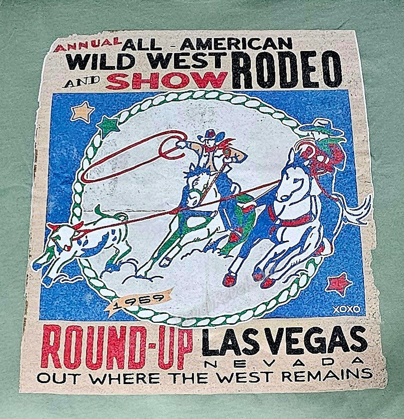 A vintage rodeo poster advertisement from Las Vegas featuring team ropers. Printed on a sage green crewneck tee.