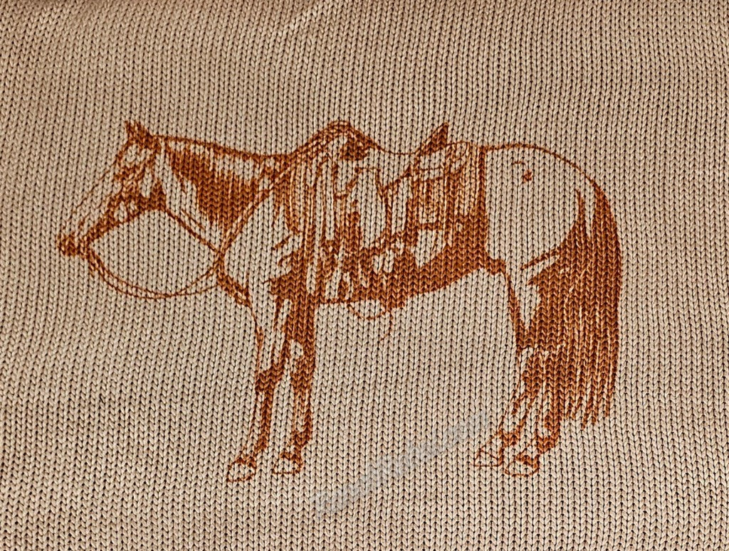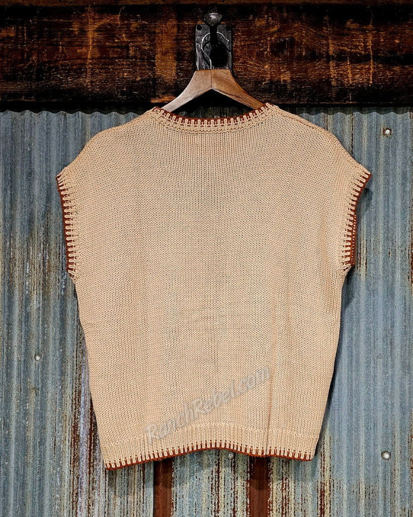 A light apricot colored sweater vest with sorrel trim around the neckline, cap sleeves & bottom hem. The front features a saddled ranch horse in the same sorrel trim color. Cute alone or layered under something or over a long sleeve mesh or denim top.