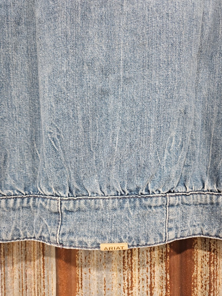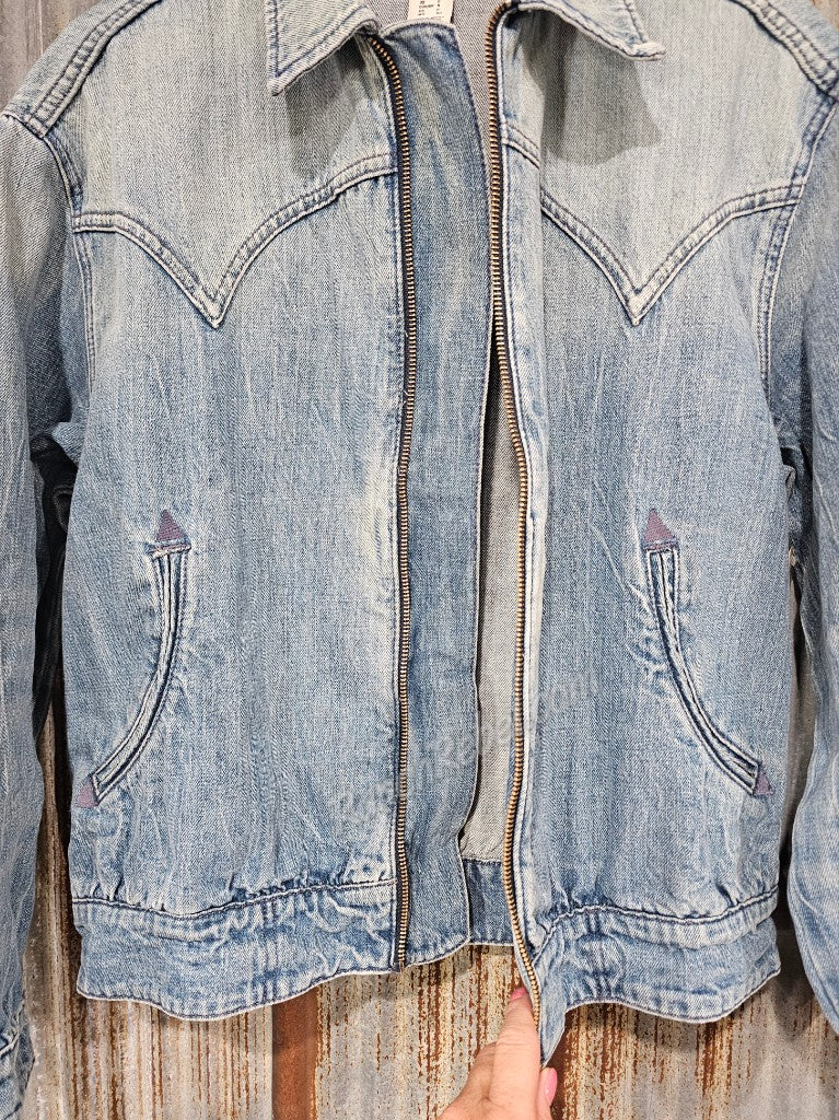 A light wash denim bomber jacket with all the details! It has a zip front with a denim panel under the zipper. It has a denim collar, full sleeves with soft gathers at the single button cuff, a denim band at the bottom hem, front & back western yokes & front functioning arrow pockets.