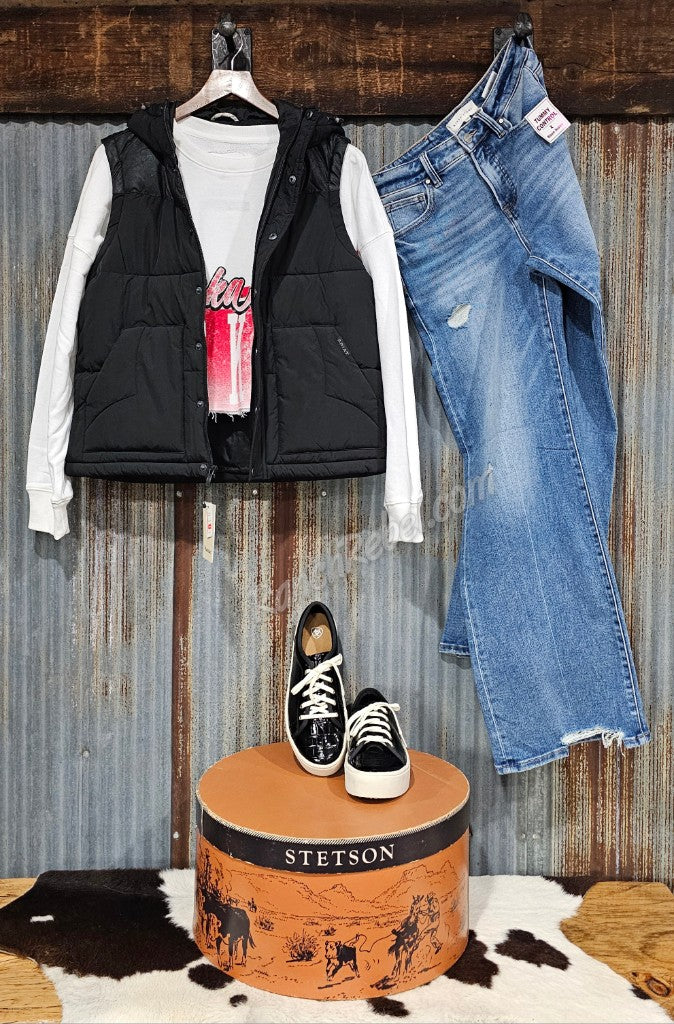 A black puffer vest with a zip front & snap storm flap. It has front pockets with western stitching, a hood with adjustable cord closure & front & back black leather look yokes.
