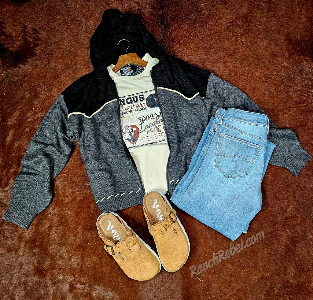 A cream colored tee with cattle breeds & an Angus & Hereford Bull inside a rope border.