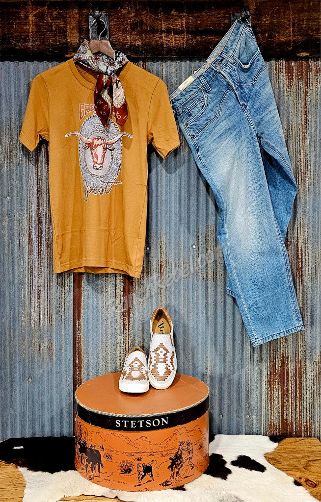 A warm toast colored crew neck tee with original artwork featuring a longhorn against a blue paisley background.
