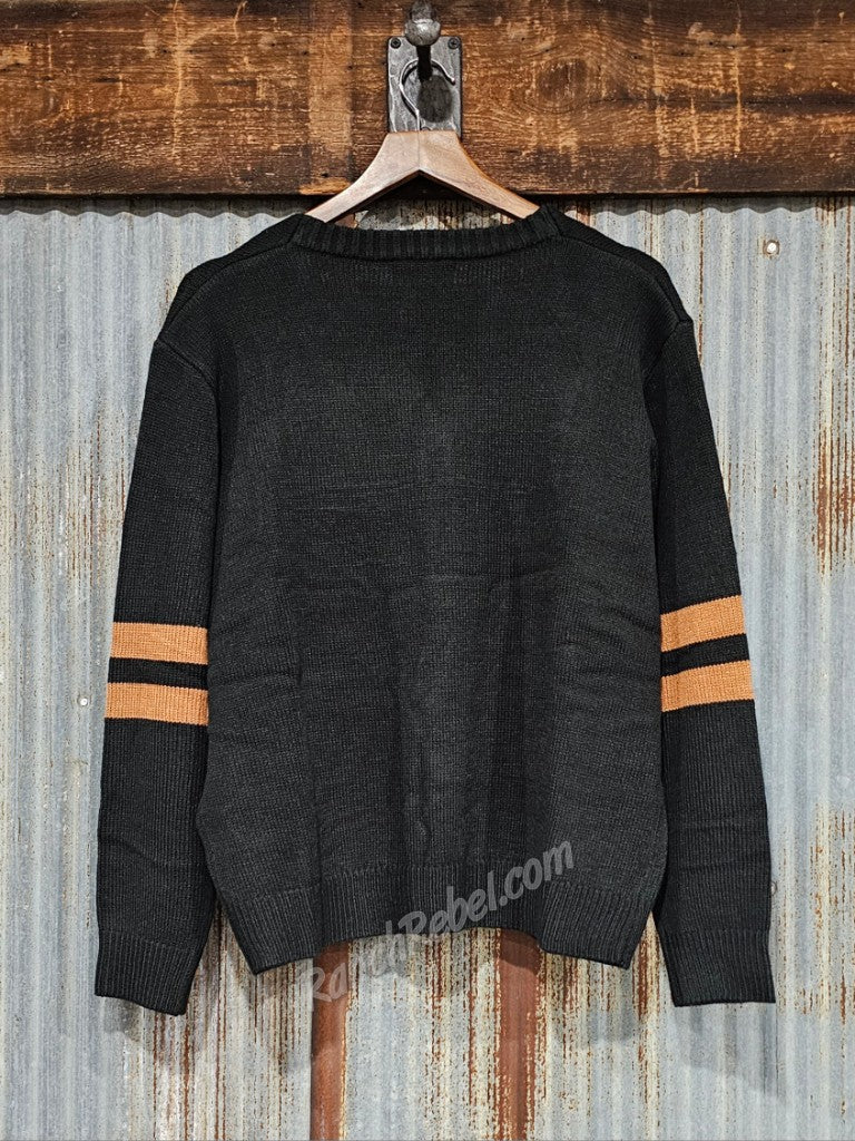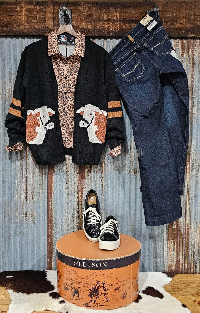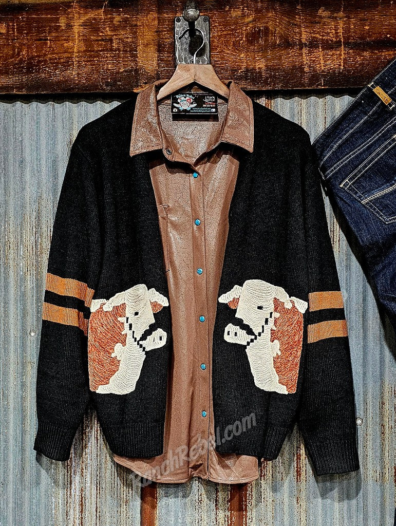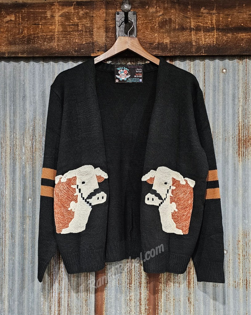 A black knit sweater cardi with a button close & chenille Herefords on the front. It has Hereford brown stripes on the sleeves.