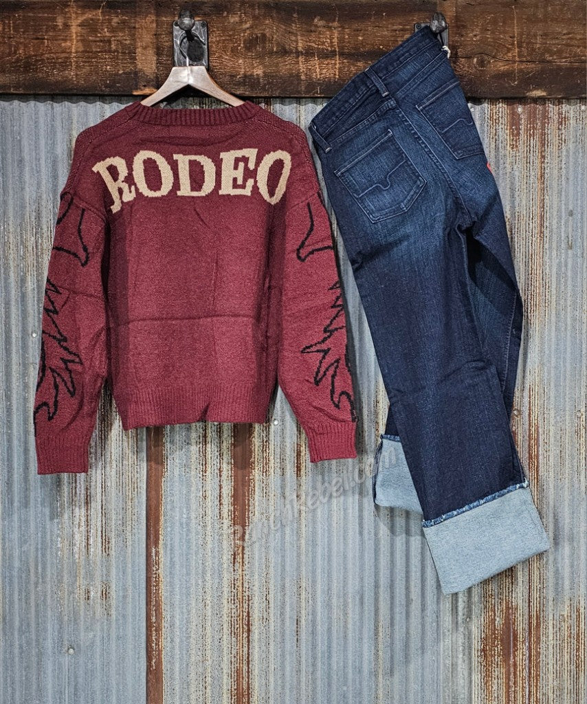 A wine colored sweater with a bronc rider on the front, RODEO on the back & bootstitching down the sleeves, all knit into the sweater.