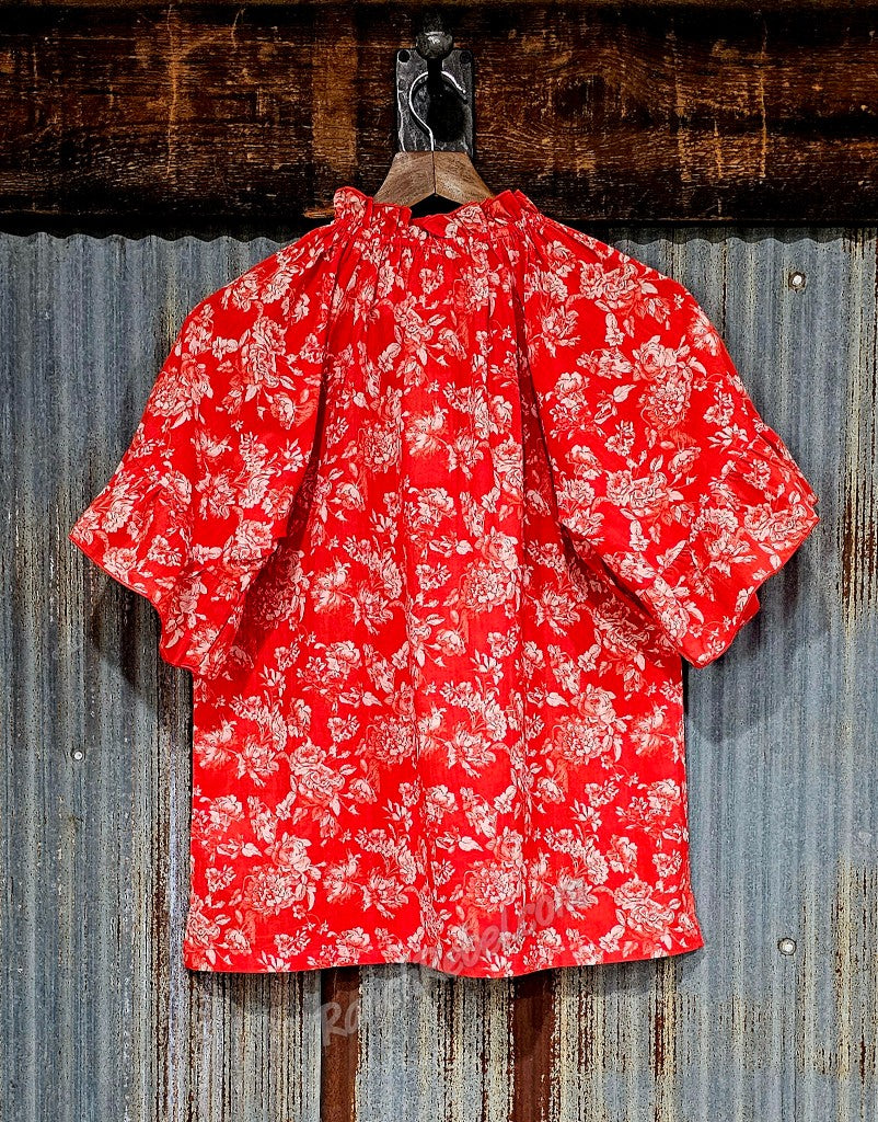 A flowy cotton top in bright red with a white floral print. It has raglan style sleeves with a ruffle edge, an elastic neckline with a small ruffle, tie front & keyhole neck. The body is relaxed & it has small side slits.